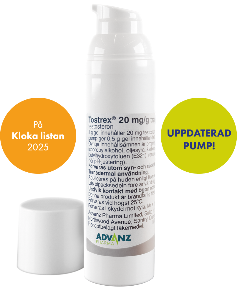 Tostrex ® 20 mg/g transdermal gel. Särskild receptblankett krävsKlar, färglös till svagt gul gel. Ett gram gel innehåller 20 mg testosteron. 1 x 60 g flerdosbehållare med en doseringspump medfast volym. Ett tryck på behållarens kolv ger 0,5 g gel innehållande 10 mg testosteron. Indikation: Substitutionsbehandling medtestosteron mot manlig hypogonadism när testosteronbrist har bekräftats av kliniska symtom och laboratorieanalyser.Dosering: Vuxna och äldre män: För kutant bruk. Rekommenderad startdos av Tostrex är 3 g gel (60 mg testosteron) somappliceras en gång per dag vid ungefär samma tidpunkt varjemorgon. Den dagliga dosen bör inte överstiga 4 g gel (80 mg testosteron). Kontraindikationer: Känd eller misstänkt bröst-eller prostatakarcinom, överkänslighet mot den aktiva substanseneller något hjälpämne. Varningar och försiktighet: Testosteroninsufficiens ska klart ha påvisats genom kliniska fynd ochbekräftats genom två separata blodtestosteronmätningar. Behandling med testosteron kan hos patienter med svår hjärt-, lever-eller njursvikt eller med ischemisk hjärtsjukdom ge upphov till svåra komplikationer kännetecknade av ödem med eller utankronisk hjärtinsufficiens. Behandlingen måste upphöra omedelbart om sådana komplikationer inträffar. Tostrex ska användasmed försiktighet hos patienter med hypertoni ochkoagulationsrubbningar, samt bör användas med förskitighet vid epilepsi, migrän eller skelettmetastaser. Tostrex är ej indiceratför behandling av manlig sterilitet eller impotens. Innan substitutionsbehandling med testosteron påbörjas måste alla patientergenomgå en grundlig undersökning för att utesluta risken för befintlig prostatacancer. Androgener kan påskynda utveckling avsubklinisk prostatacancer och benign prostatahyperplasi. Testosterongel kan överföras till andra personer vid tät hudkontakt,vilket medför förhöjda testosteronnivåer i serum och eventuella biverkningar. Biverkningar: De vanligaste rapporteradebiverkningarna är reaktioner på appliceringsstället inklusive: parestesi, xeros, pruritus och utslag eller erytem. Fertilitet,graviditet, amning: Tostrex är endast avsett att användas av män. Tostrex är ej indicerat för gravida eller ammande kvinnor.Studier på kvinnor saknas. Gravida kvinnor skaundvika all kontakt med hud behandlad med Tostrex. Datum för översyn av SmPC: 2025-04-30. För fullständig information:www.fass.se. Advanz Pharma, Abcur AB, Bergaliden 11, 252 23 Helsingborg.