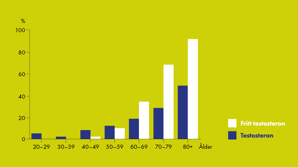 Totalt testosteron < 11,3 nmol/l (325 ng/dl) (blå staplar) eller beräknat fritt testosteron < 0,153 nmol/nmol (vita staplar).
