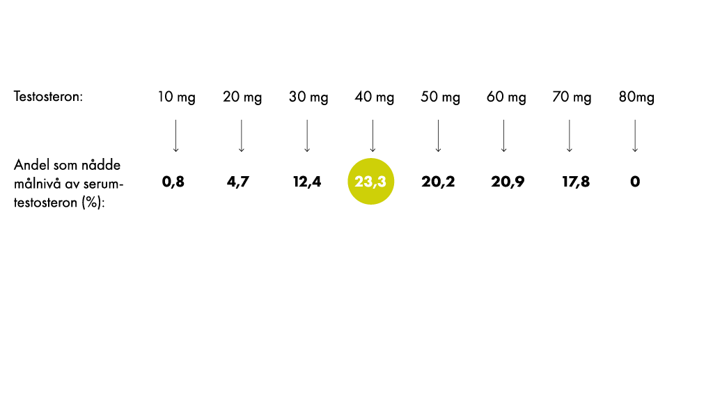 - < 50 μg/l bör dosen ökas till 80 mg testosteron/dag (4 g)