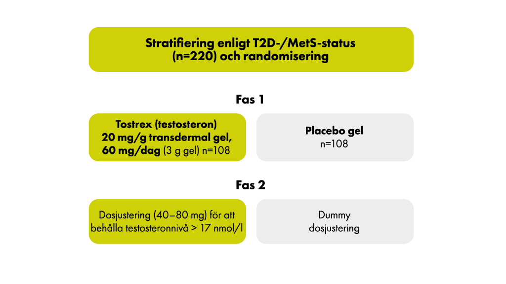 Time2-studien utvärderade effekterna av transdermal behandling med Tostrex (testosteron) 20 mg/g transdermal gel avseende insulinresistens, kardiovaskulära riskfaktorer och symtom hos hypogonadala män med typ 2-diabetes och/eller metabolt syndrom (MetS).3