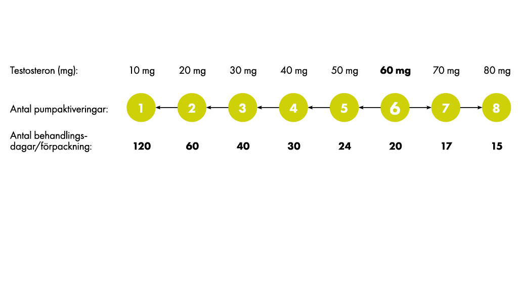 - Efter initial priming ger den uppdaterade pumpen 10 mg testosteron (0,5 g gel) i varje tryck(när pumpen trycks ned helt).